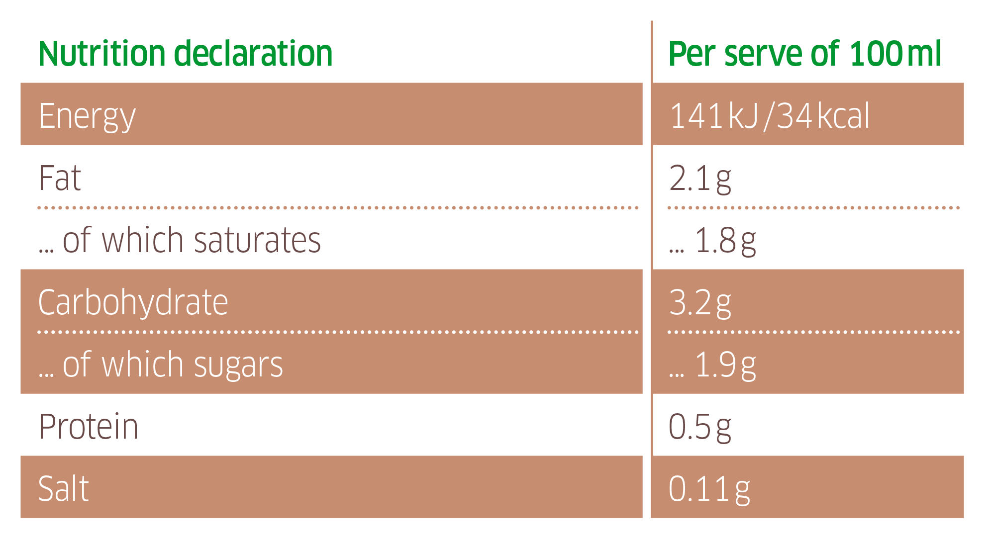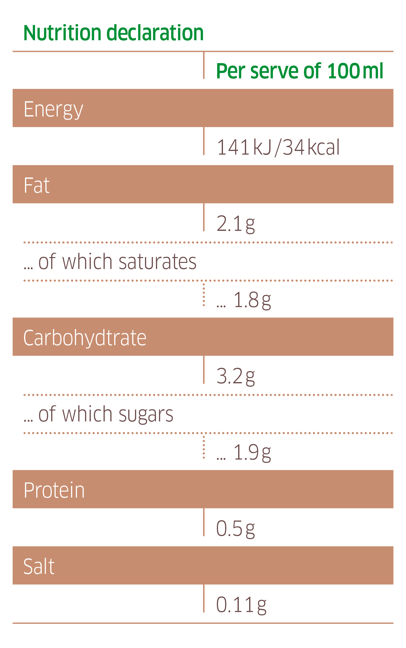 Ingredients: coconut juice from coconut juice concentrate* (62%), light coconut milk* (22%), coffee preparation* (16%, water, instant coffee*), salt, thickener: gellan.